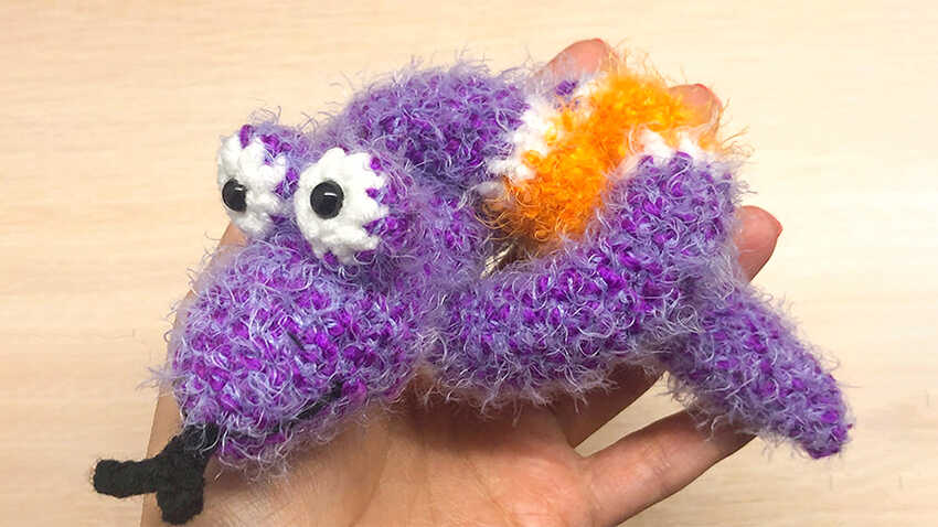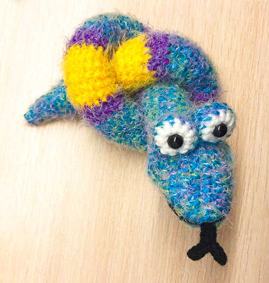 The whole body of the snake is crocheted as follows: 8 blue rows, 2 purple rows, 6 yellow rows, 2 purple rows and so on.